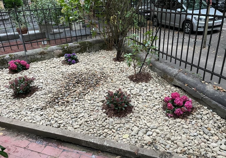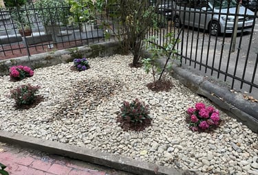 Installation de terrasses, allées et plantations harmonieuses.